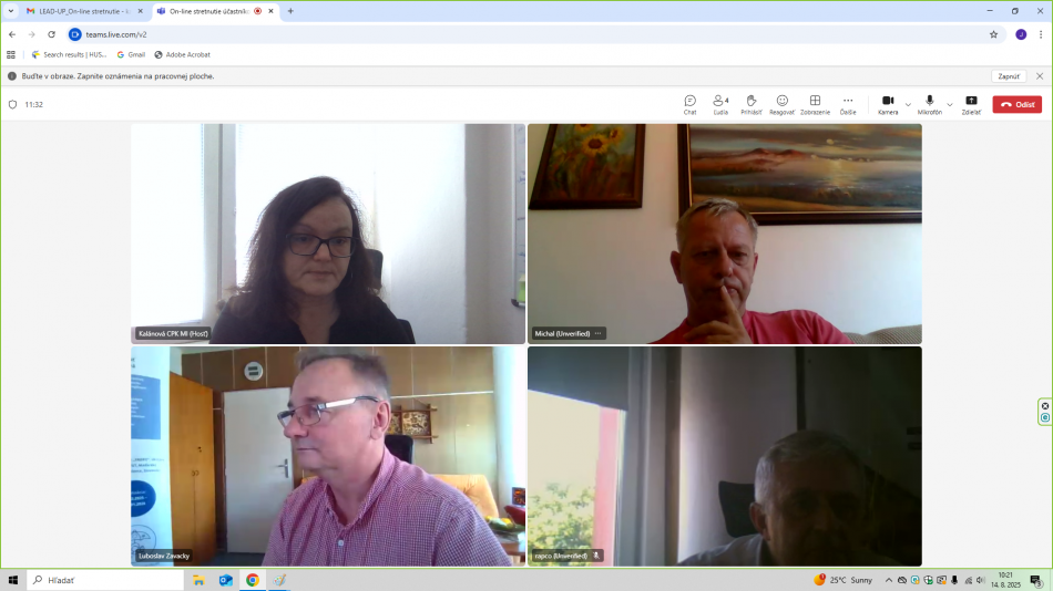 - On line stretnutia sa nemohol zúčastniť LD expert projektu Mgr. Dudášová Veronika, ktorá projektovému tímu pred on-line stretnutím podala presné pokyny a informácie ohľadom pracovnej verzie vypracovanej analýzy potrieb, potenciálu a prioritných smerov rozvoja cieľových skupín v kontexte cezhraničnej spolupráce v rámci projetku LEAD-UP.
